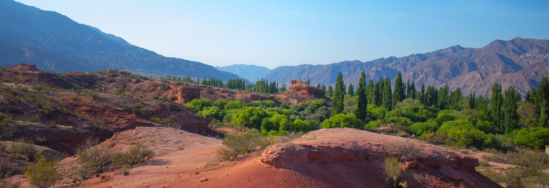 Rodeado de montañas que varían entre el rojo carmín y purpura, acompañado de verdes arboles y un cielo libre de contaminación
